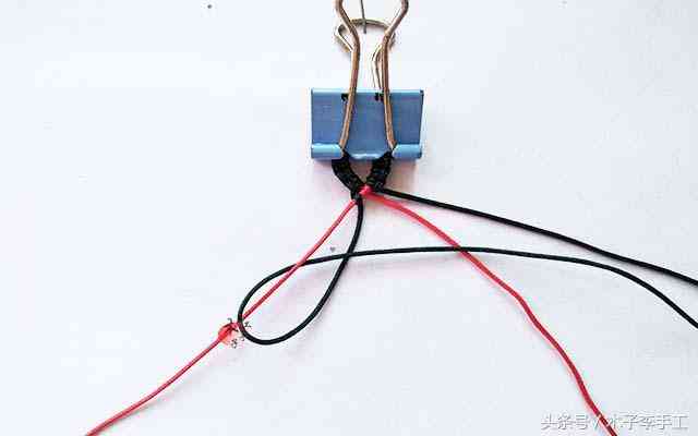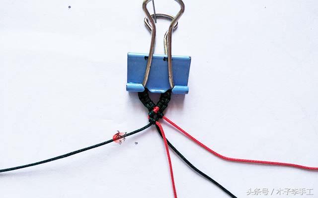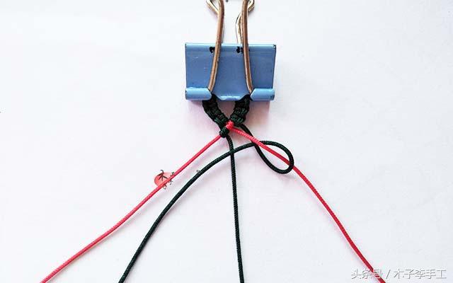 2、准备用两根红色线做斜卷结,右边的红线做轴,左边的红线做斜卷结