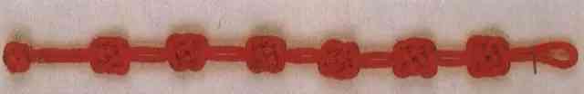 吉祥结可参照草花结,吉祥结相当于四个花瓣的草花结中外耳拉紧后,开始调节外耳大小。调整时,外耳不可留太小,以免松开。