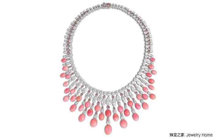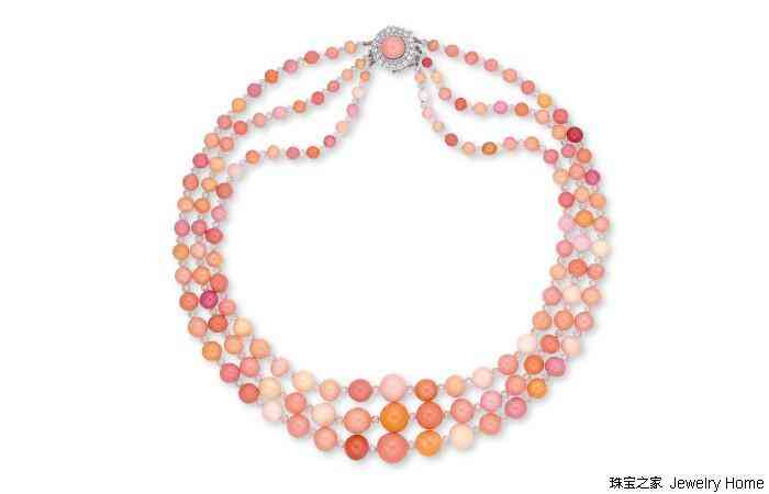 大卫·莫里斯(David Morris)设计的这条项链配有30颗总重量为102.47克拉的粉红色海螺珠,几乎每一颗都显示了独特的火焰纹