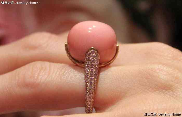 这颗由David Morris打造的戒指中心的巴洛克式粉红色海螺珠重达44.55克拉
