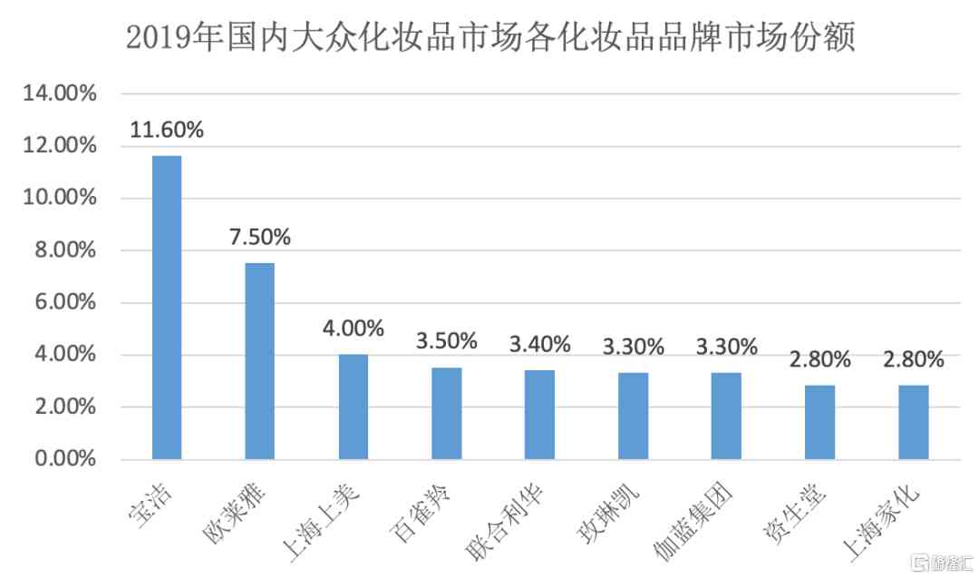 据前瞻研究院数据分析,2019年,欧莱雅和雅诗兰黛占据市场份额的前二,分别为15.2%和10.8%。高端市场被国外产品垄断,国内本土化妆品因为品牌、质量等问题无法短时间内抢占中高端市场,为求生存和发展,纷纷集中火力进攻大众市场。导致大众市场品牌多且杂、竞争极为激烈。在大众化妆品市场,国外品牌宝洁占据主要市场份额,约为11.6%,其次是欧莱雅,占比约为7.5%。本土品牌上美集团、百雀羚、珈蓝集团和上海家化各占有一定的市场份额,上美集团占比为4%。