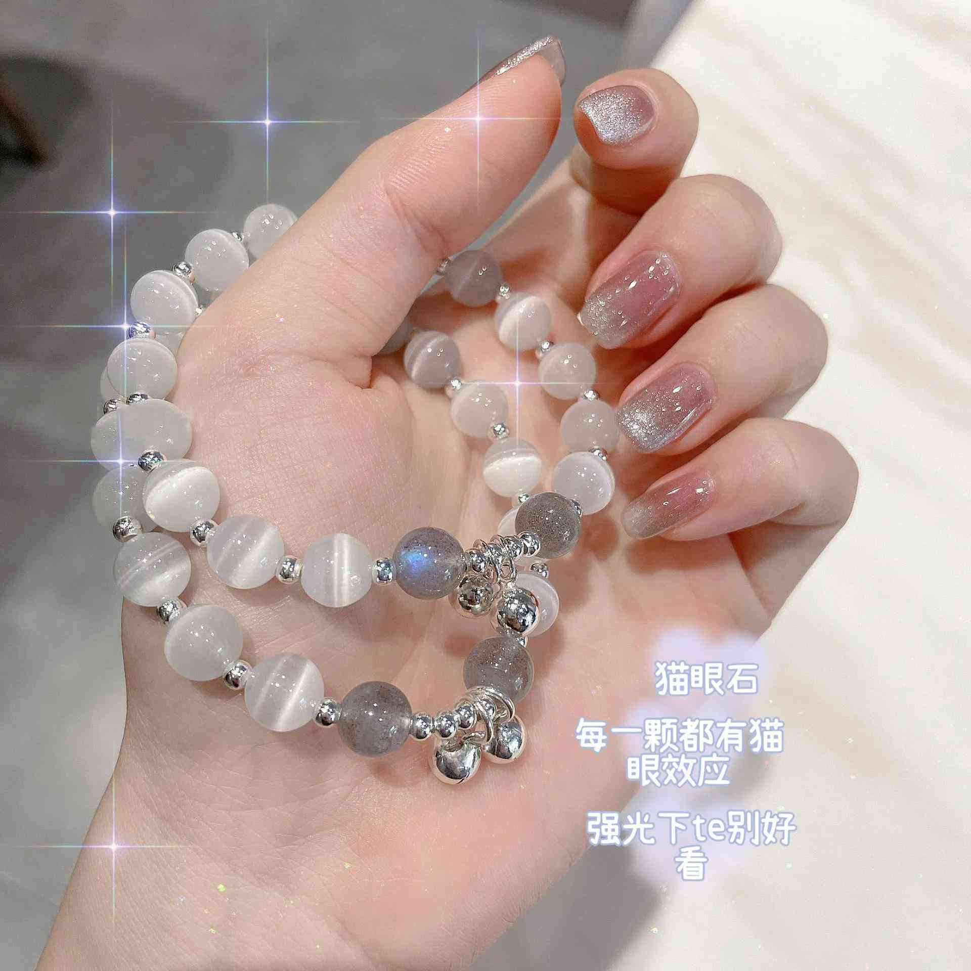 让我看看,还有人没安排上这么好看的手链吗?干净清澈的月光石手链,就两个字:好看!!!寓意也超好,是猫眼石、灰月光、小铃铛串成的,猫眼石寓意:希望、好运和祝福。灰月石代表:新生、优雅和高贵,因为它有着淡雅、柔和的颜色。还有这两个小铃铛,微微响,不会很大声,价格:68.08元。手链的清冷感氛围拉满,戴上超级好看!!!