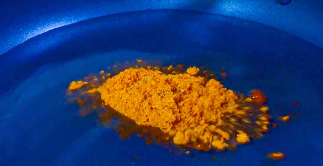 2.接下来准备木薯淀粉200克将其倒入盆中,木薯淀粉一般在超市里都能买得到大家可以放心学习了。然后将熬好的红糖水多次少量的倒入里面,用筷子将其搅拌成絮状。