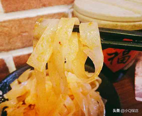 听店家说,他们家的擀面皮跟平常的面皮不一样,它是经过发酵的,所以吃起来会很劲道,同时呢,也会带点酸味。