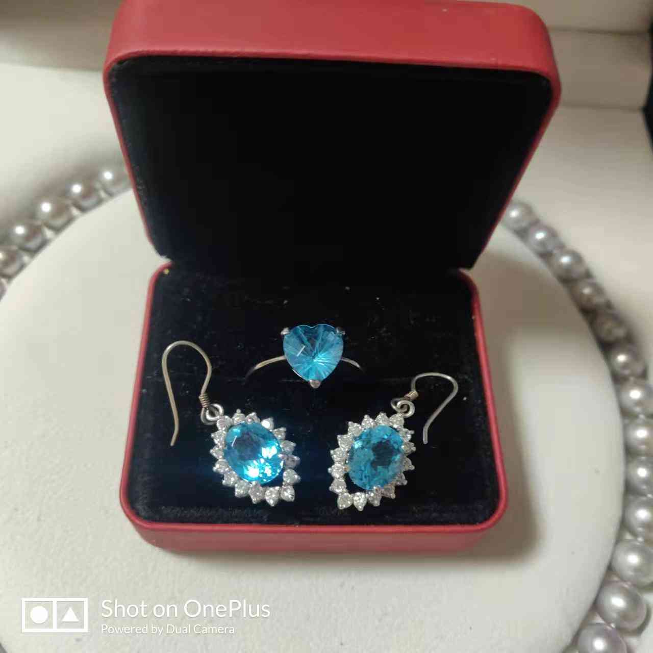 先介绍这套蓝色的托帕石首饰的由来:10年前,我在大连新天地商城的周大福店买了这个蓝色的戒指。售货员告诉我这是托帕石银镶,并且有证书,当时的价格是800多元。后来我觉得一个戒指太单调,就网购了这对托帕石耳环。店家告诉我是天然托帕石,也有证书,当然,现在想来这种证书有没有其实不重要。价格是600多,我认为很便宜就买了。