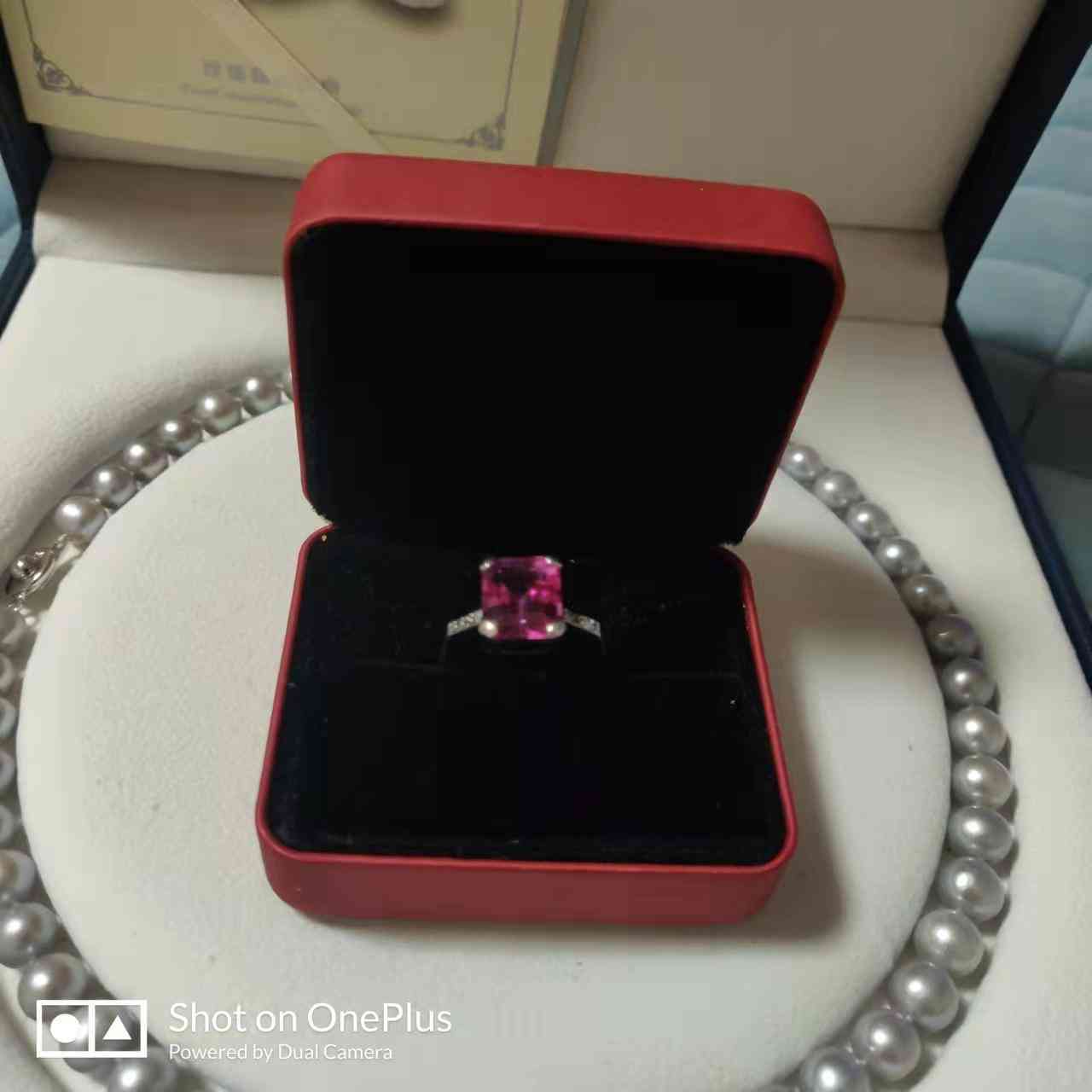 对,就是这个粉色托帕石戒指。这个粉色的托帕石看起来像天然的东西,所以我更觉得那对蓝色耳环是玻璃的。
