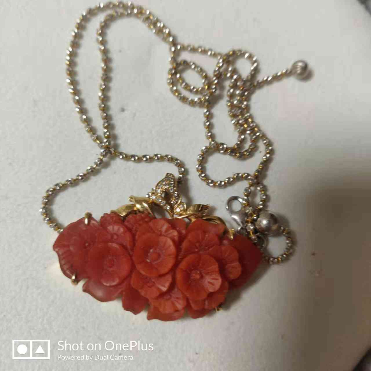 去年牛年,中国人的本历年喜欢戴点红色,于是我在网上购买了这个南红吊坠。在一个专门卖南红的旗舰店上购买的,价格打折后3200元,为了配这个吊坠又买了这个K金的项链,价格是2400元左右。