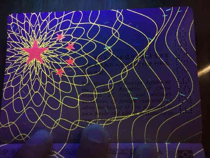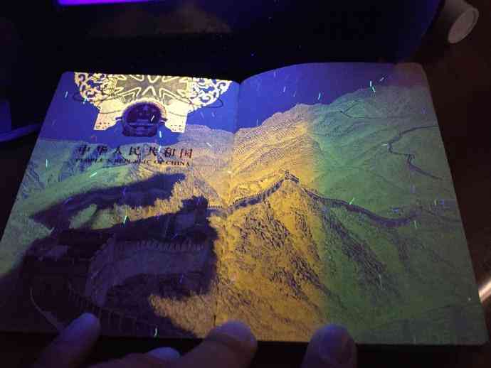 紫外线灯下的护照首页。
