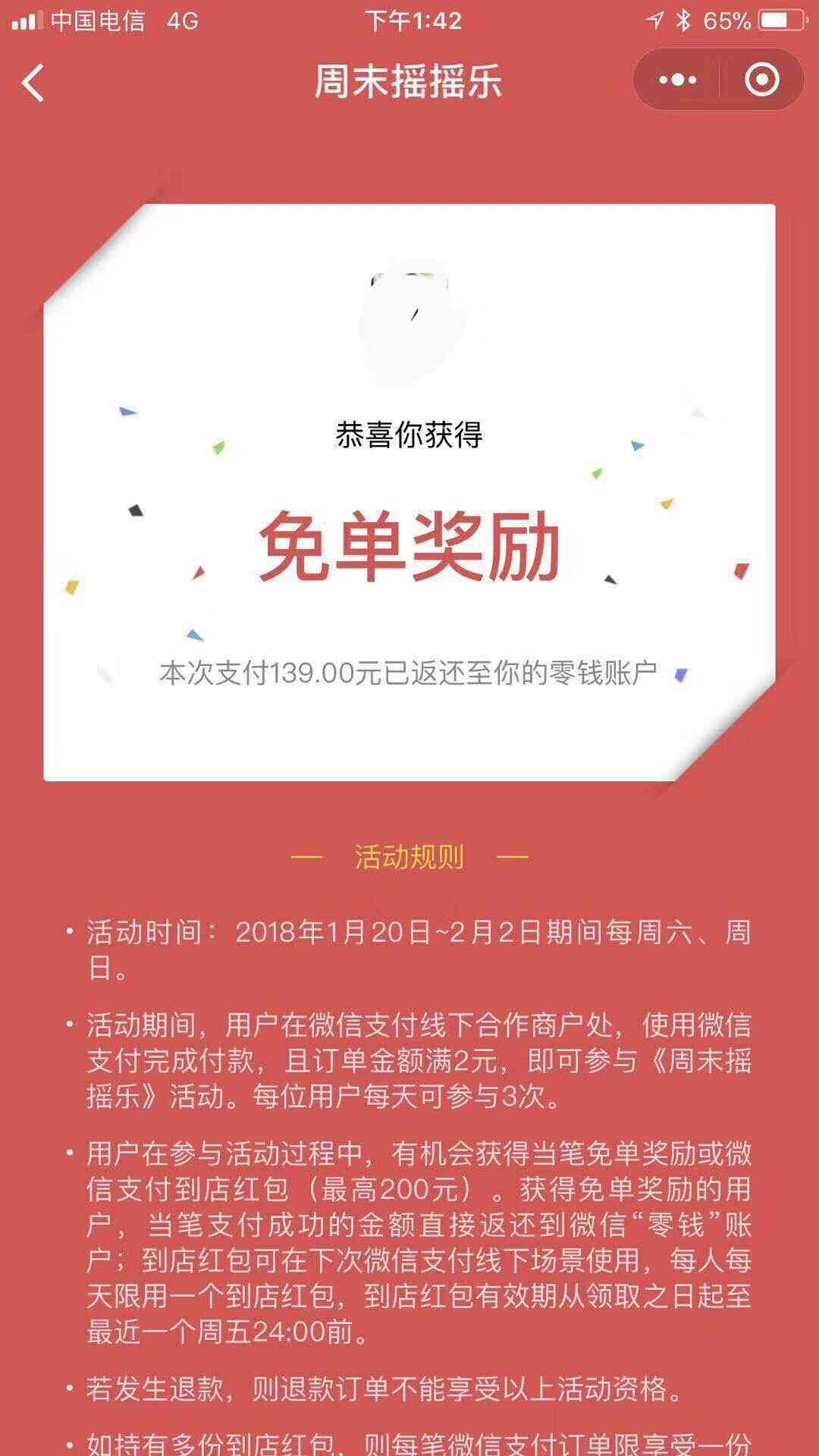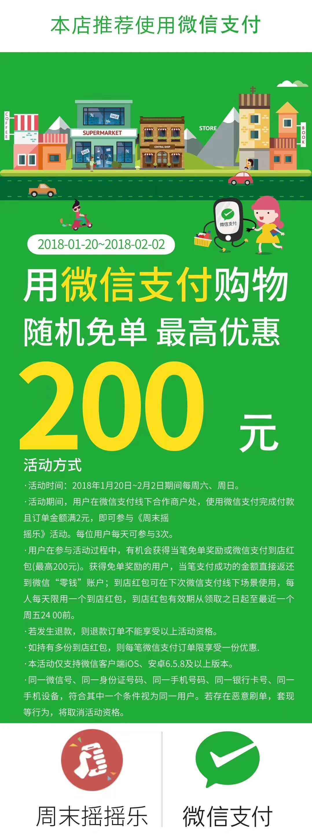 周末摇摇乐,只要在微信支付线下合作商户使用微信付款,即可参与周末摇摇乐活动。不仅有机会获得到店红包,如果你运气好,还有可能获得随机免单机会。