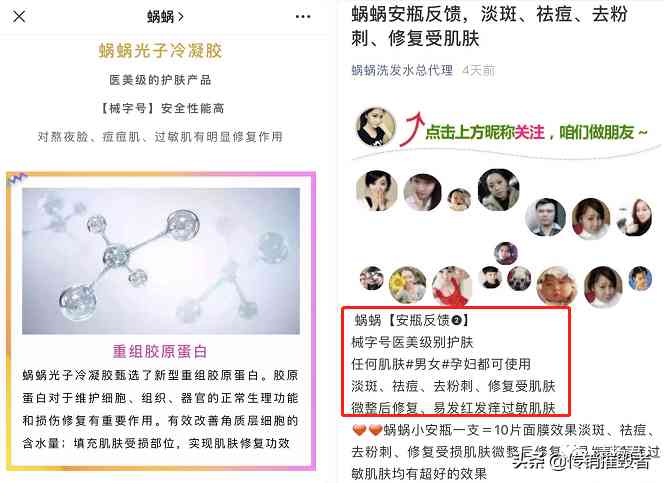 文章中称:蜗蜗光子冷凝胶,医美级的护肤产品,【械字号】安全性能高,对熬夜脸、痘痘肌、过敏肌有明显修复作用。文章还以“重组胶原蛋白”成分暗示产品具有“有效改善角质层细胞的含水量;填充肌肤受损部位,实现肌肤修复功效。”