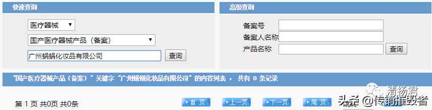 清扬君国家药监局医疗器械数据库中查询后发现,在医疗器械产品备案中并无“蜗蜗医用冷敷贴、蜗蜗光子冷凝胶”的备案信息,用企业关键词搜索“广州蜗蜗化妆品有限公司”亦无任何备案信息。