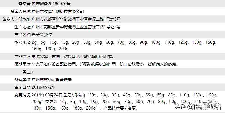 清扬君在这里再延伸科普一下相关知识:如果蜗蜗公司是以单纯的销售方出现的,那么该产品就只能以“备案号”对应的名称销售,不能使用“蜗蜗+产品名”的形式出现,因为这样就改变了产品备案信息。比如,蜗蜗光子冷凝胶标识的医疗器械备案号为“粤穗械备20180076号”,该产品对应的申请人为“广州市妆泽生物科技有限公司”,产品名称为“光子冷凝胶”。如果蜗蜗公司只是销售方,那么“蜗蜗光子冷凝胶”的产品名应为“光子冷凝胶”,不得私自改变;如果蜗蜗公司想使用“蜗蜗光子冷凝胶”的名称,那就需要重新注册或备案。