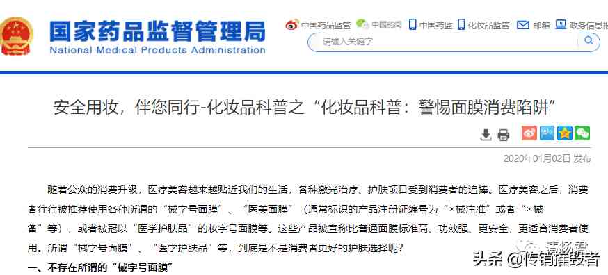 实际上,早在2020年1月2日,国家药监局发布的《化妆品科普:警惕面膜消费陷阱》就对“械字号产品”的定义和宣传做了科普。