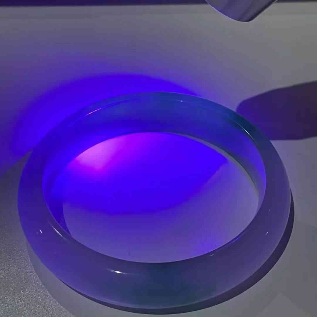 对于B+C翡翠,101热卖给大家分享一个最简单的方法,就是全暗的环境一下用紫外荧光灯照一下,会有蓝白色的荧光,像照妖镜一样,一照便知。没有紫外荧光灯的话验钞灯也可以哦。蓝白色荧光是胶和酸最典型的反应,天然玉石在紫外荧光灯下是没有荧光的哦。