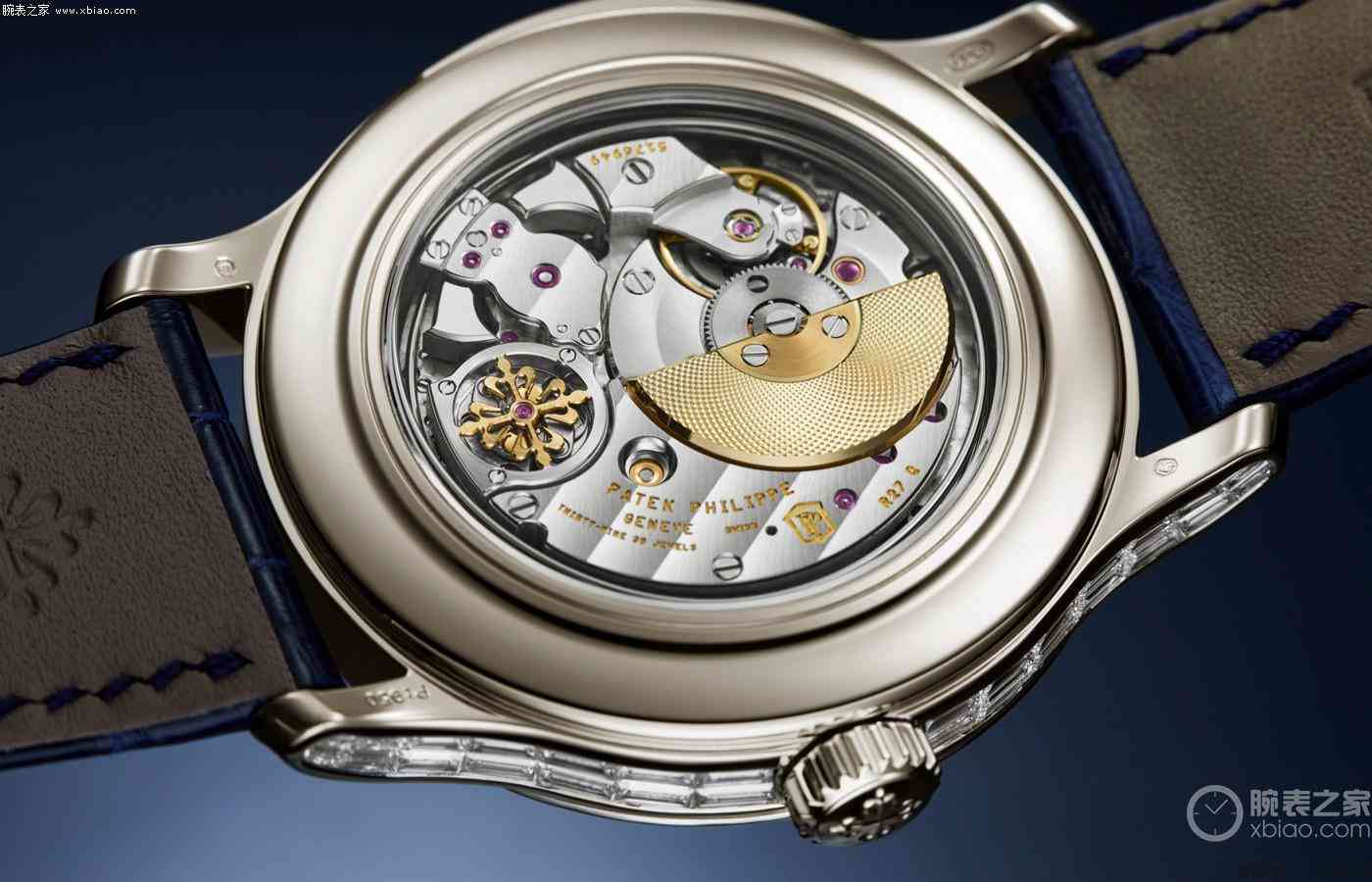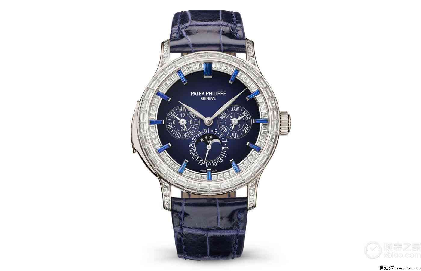 这款全新腕表依然沿用了与2016年5374P的铂金表壳,表壳四周以及下凹式表圈上均镶嵌有长形钻石,钻石经过特殊的切割方式组成精致环形,将表盘包裹在内,搭配上蓝色蓝宝石时标以及蓝色盘面,仿佛像繁星当空的夜晚,神秘又迷人。在盘面3、6、9点钟位置处分别设有月份及闰年周期显示盘、月相日期显示盘以及星期及24小时显示盘,三个小表盘对称分布于盘面之上,时标与指针均采用白色设计,与蓝色表盘形成鲜明对比,阅读清晰。