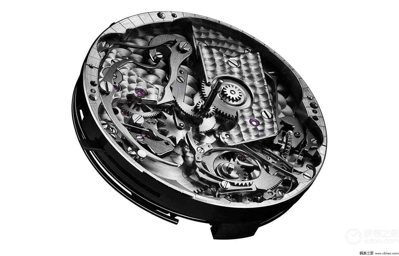 透过蓝宝石水晶底盖,可以欣赏到宛如艺术般的机芯运转的魅力。腕表所搭载的Cal.R 27 Q自动上弦机芯配备三问报时装置,两根“教堂”音簧绕机芯近两圈,鸣音饱满而深沉。