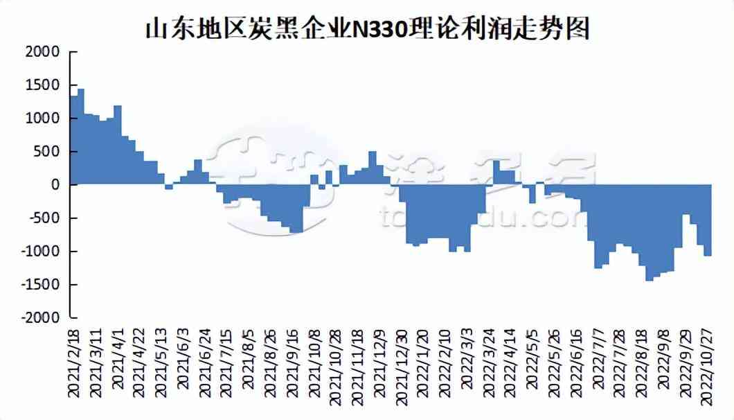 本周,原料煤焦油价格继续上行,炭黑企业成本端提振明显,然下游市场对炭黑需求持续弱势,场内交投僵持,炭黑理论亏损额度较上周增加173元/吨。以山东地区炭黑企业N330为例,截止目前,炭黑行业理论利润亏损1080元/吨。