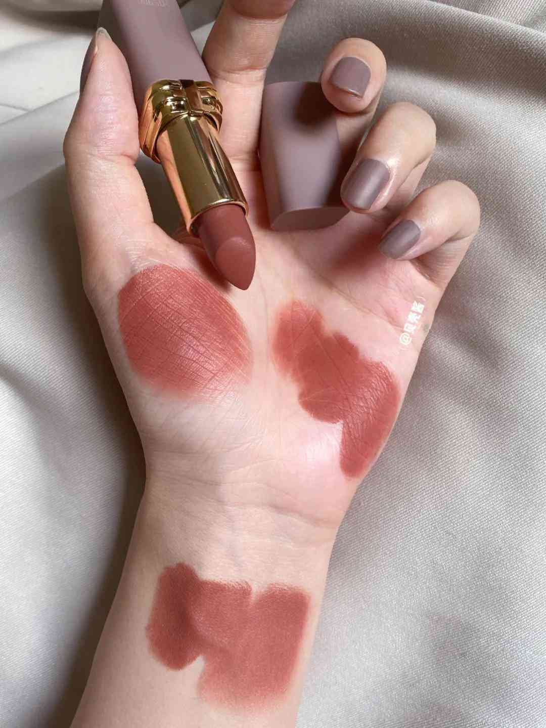 真的很冷门的颜色,但是它是王炸奶茶色,颜色好看又好用。饱和度偏低,不会不显气色,是带着土调的奶茶色,上嘴温柔又很显白,厚涂简直就是温柔御姐本人了,颜色超级好看,怎么就没人知道呢。是很顺滑的哑光质地,很舒服,不会拔干,不过就是膏体比较软,使用的时候不要转太多出来。