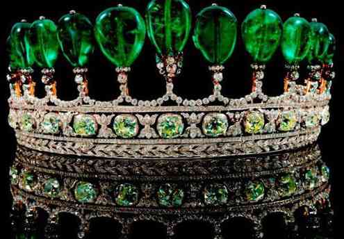 这顶美艳绝伦的皇冠属于瑞典公主(katharinahencket von donnersmarch),她曾是Ostfriesland这片土地的摄政者。这顶皇冠由被业界誉为“静香美钻”的绿色宝石镶嵌而成,一片浓碧,靓丽异常,总重大约101.27卡拉,曾经在苏富比著名珠宝拍卖会上出售。