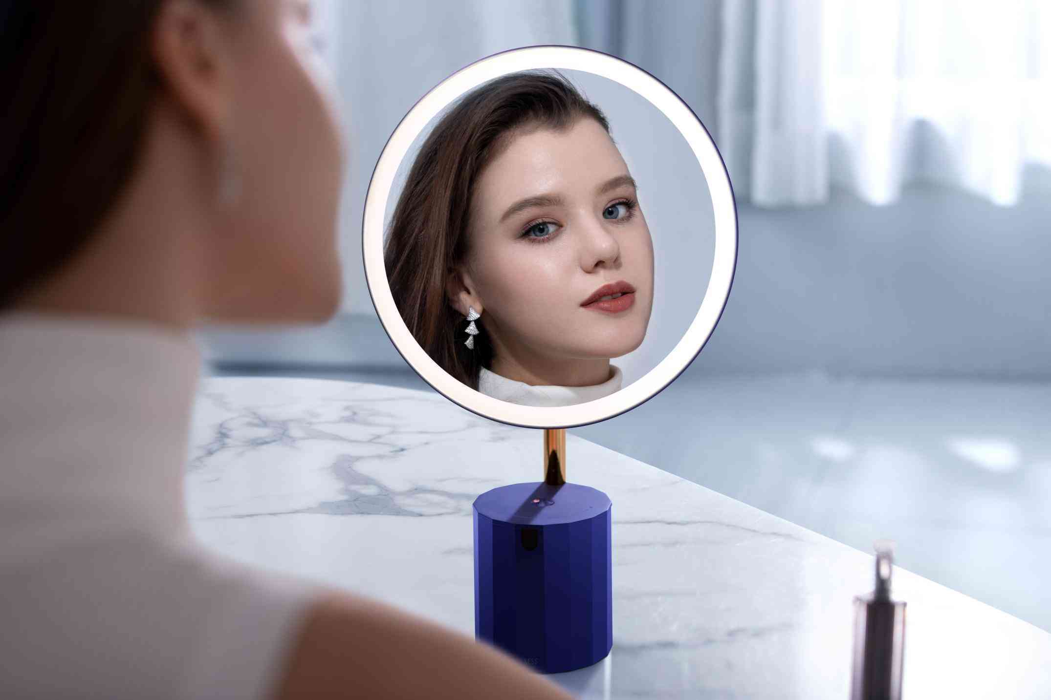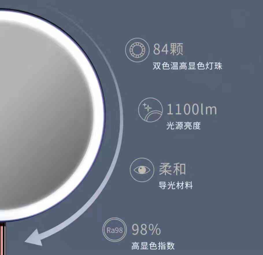 而XESS美妆镜的光是模拟太阳光的自然光线,搭配360°的侧入式环形光源以及84颗灯珠,亮度高达1100lm,光线清晰均匀却不刺眼,显色度甚至可以达到98%,镜面中呈现的妆容非常真实。所以对着这个镜子化妆,就能知道太阳光下的妆容效果什么样,完全不用担心化浓或者化淡的误差发生,萌新练手时也更容易一些。