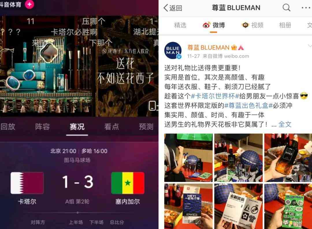 而2022年,除花西子品牌在抖音世界杯专题内的广告:“送花,不如送花西子”,瞄准世界杯背后广大球迷送礼需求外,其它多是男士化妆品在“蹭热度”,比如尊蓝推出了世界杯限定版,蓝系化妆品发布“世界杯非官方放假通知”,以冠军有奖竞赛的形式与其目标受众互动。