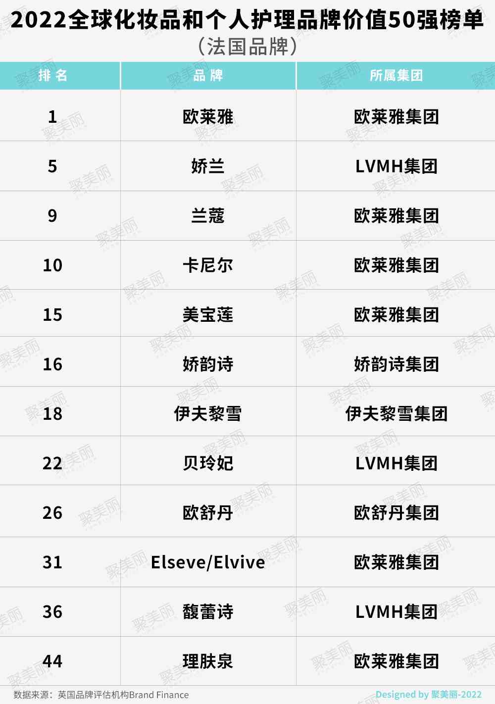 在今年英国品牌评估机构Brand Finance发布的“2022全球化妆品和个人护理品牌价值50强(以下统称“Cosmetics 50 2022”)中,我们也可以看到欧洲品牌占据近半数,这其中进入本届世界杯八强的法国,上榜的化妆品品牌居多。