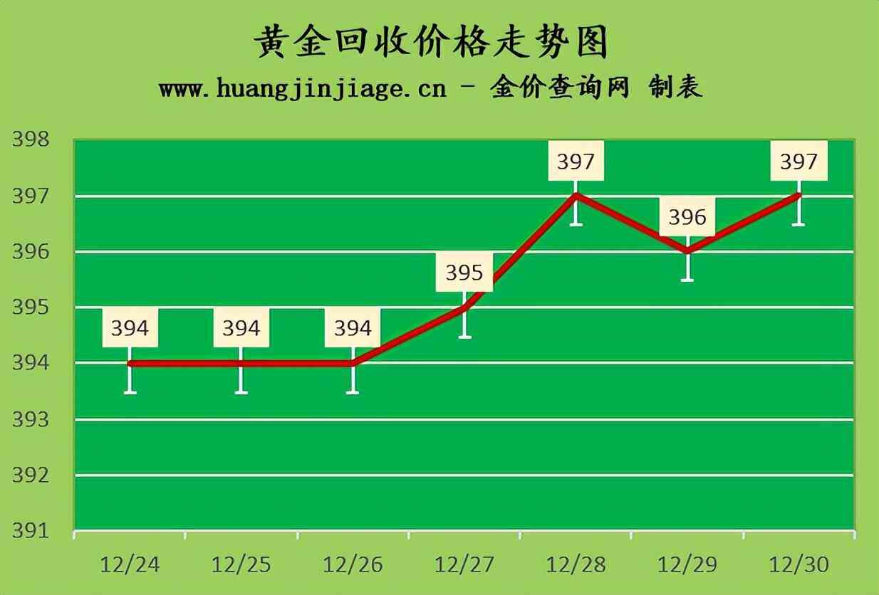 黄金回收价格397元/克,铂金回收价格200元/克,钯金回收价格366元/克,18K金回收价格294元/克,银条回收价格3.8元/克。(黄金行情是波动的,回收金价没有固定标准。)