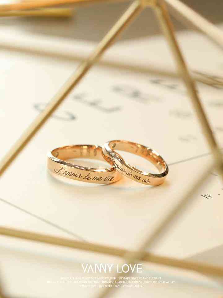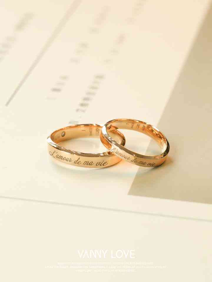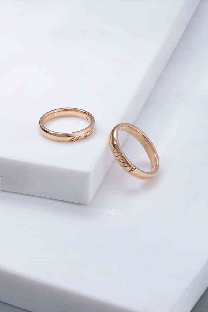 如果想有心意的话,可以再在两枚戒指分别刻上小一些字号值得纪念的数字或者代表爱的符号。
