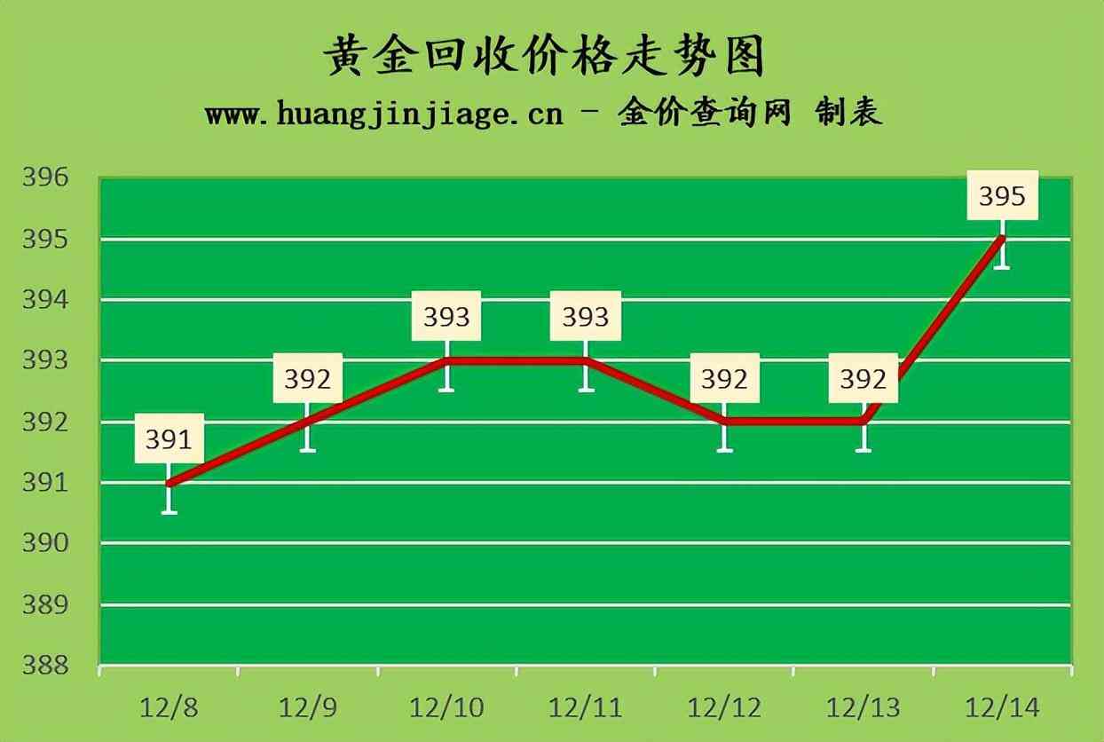 黄金回收价格395元/克,铂金回收价格199元/克,钯金回收价格390元/克,18K金回收价格292元/克,银条回收价格4元/克。(黄金行情是波动的,回收金价没有固定标准。)