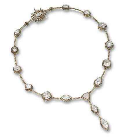 这款项链叫做H斯特恩金星项链,是复古风的造型,黄金质地的链条在外观上给人耳目一新的感觉。在链条的表面每隔相同的间距便点缀了一颗大钻石,这些钻石的形状各不相同,外面还包了一圈金属边框且镶嵌上一圈小钻石,看起来十分有型。这款项链的吊坠部分是两颗马眼型钻石,点缀起来非常别致,它的市场价可以达到317万美元,钻石的重量更是有110克拉,其中金色的那颗钻石就占了18克拉。