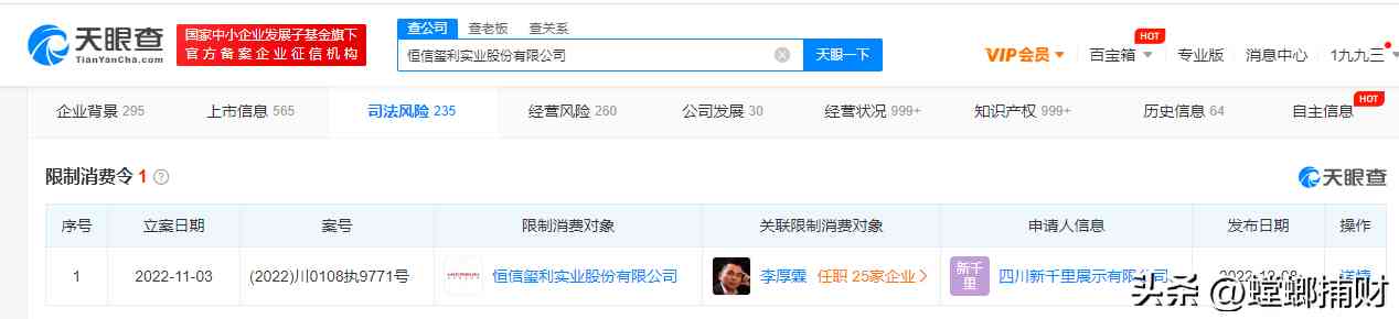 天眼查App显示,近日,I Do钻戒关联公司恒信玺利实业股份有限公司及其法定代表人李厚霖新增一则限制消费令,申请人为四川新千里展示有限公司,案由为装饰装修合同纠纷。不久前,恒信玺利实业股份有限公司因此案被强制执行23万余元。目前,该公司还存在多个被执行人信息,被执行总金额超630万元。