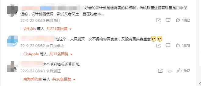 DR钻戒被诟病的主要有三个点:毛利率高,营销套路多和设计能力薄弱。据媒体报道,在同克拉、相似颜色和净度下,DR钻戒要比竞品售价高出数千元。比如其2021年上半年销量最高的FOREVER系列简奢款,成本仅为4000元左右,售价却高达1.5万元,毛利率超过72%。这个毛利率水平也远远超过了周大福、周大生等一众珠宝品牌。