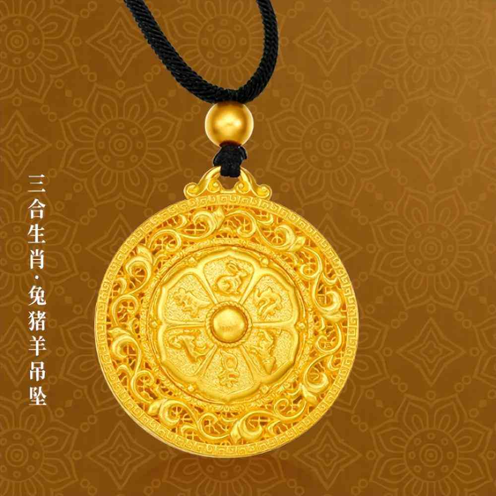 三合生肖·兔猪羊吊坠,兔为敏慧、羊为德善、猪为祥福,三和寓意和气生财、德才兼备。将生肖图案与本命佛梵文符号融入吉祥六瓣宝相花,结合时来运转的转盘设计,带来天佑福运、多重守护。
