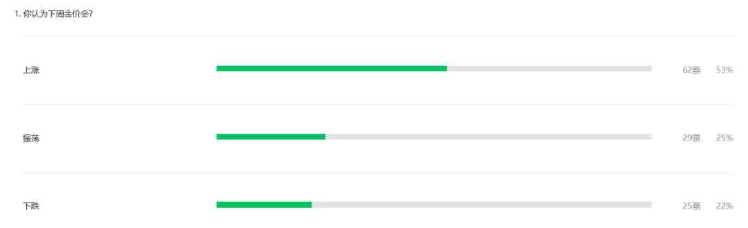 北京黄金经济发展研究中心调查显示,市场人士认为本周金价振荡可能性较大。投票显示,本周有53%的读者看涨本周金价、25%看振荡、22%看空。