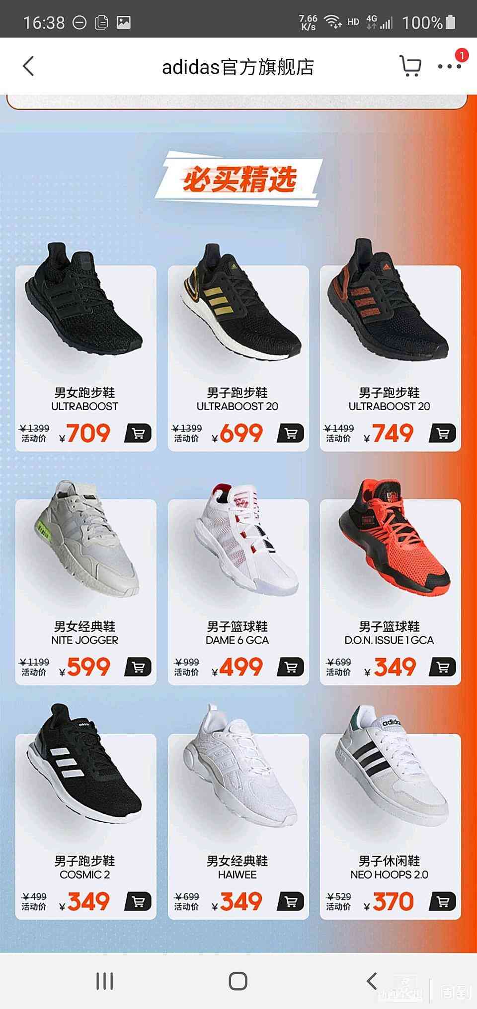 京东Adidas官方旗舰店男女鞋爆款都在打折,大都五至六折,最低49折。