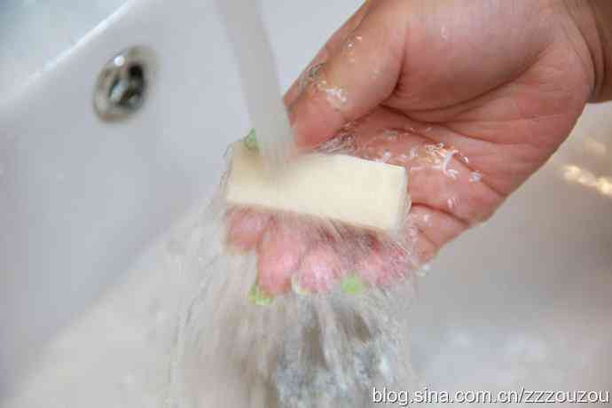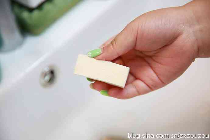 2.用粉扑清洁剂或沐浴液擦拭粉扑数次