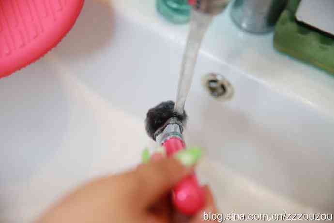 3、用指尖顺着刷毛的方向轻轻往外推,直至完全洗去化妆品的残迹,最后再用水冲洗干净就可以了