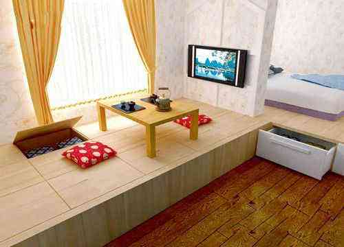 休闲飘窗地台,仔细看哦,地台里面还有机关,翻开来有暗柜,很隐蔽的强大收纳