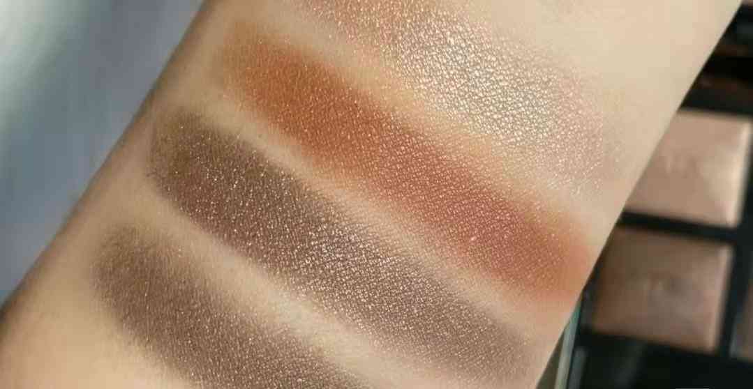 这盘的亮片色,在眼影盘中看起来有点廉价,但是抹开在皮肤上才会发现,细闪色通透感非常漂亮,点缀在眼头或是提亮卧蚕都很合适。另外两款颜色,以棕调为主,色彩比较浓郁,很适合单独涂抹,或者加眼妆加深色。