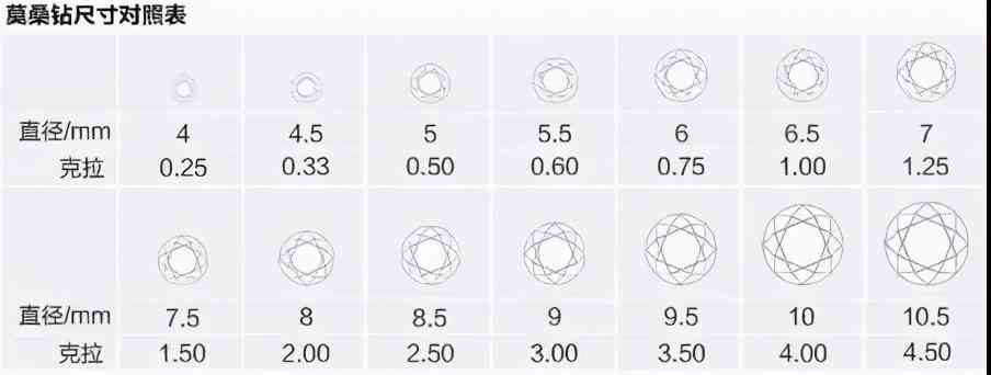莫桑石比重为3.22(钻石3.52),约比钻石轻8.8%-10%左右。按圆钻的标准车工,当直径为6.5mm时,钻石一般重量为200mg(即一个克拉)。而按标准车工制作的6.5mm圆形的合成碳化硅,重量只有160mg(80分)多一点。