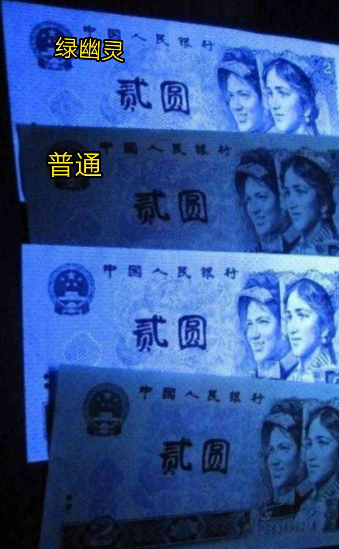 1990版的贰元发行以后,一些币商和荧光币收藏爱好者发现,这个纸币版别中有个特殊的品种,在荧光灯的照射下,这张纸币背面有很漂亮的荧光颜色,于是称它为“绿幽灵”。