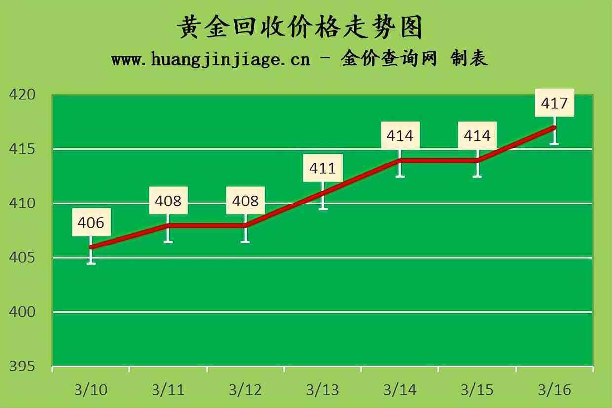 黄金回收价格417元/克,铂金回收价格186元/克,钯金回收价格294元/克,18K金回收价格305元/克,银条回收价格3.6元/克。(黄金行情是波动的,回收金价没有固定标准。)