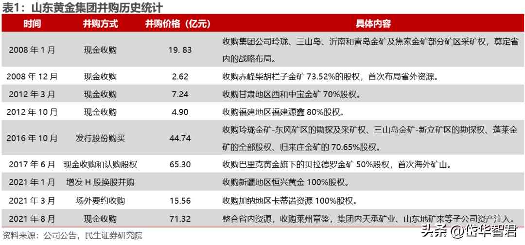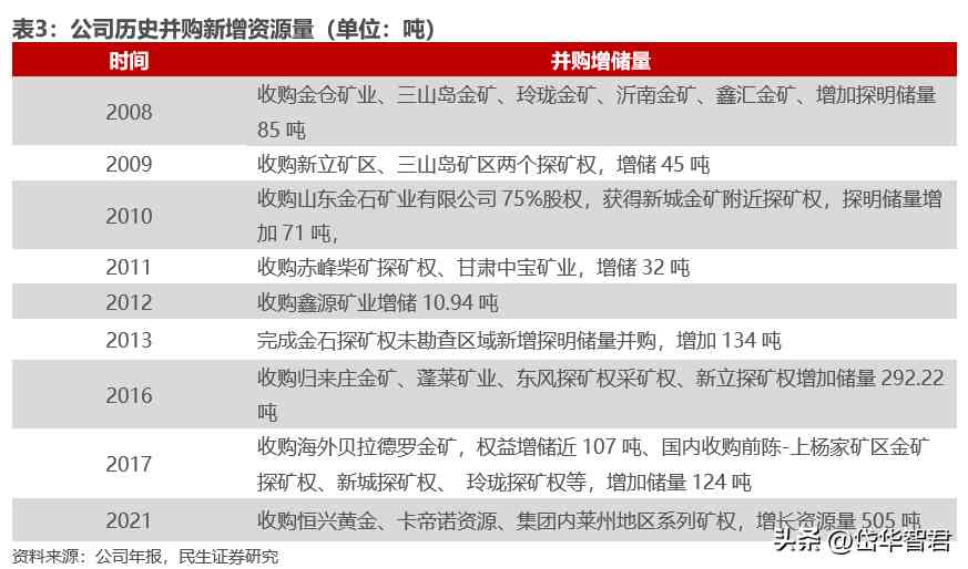 公司上市之前主要资产为莱州半岛的新城金矿,上市后利用A股上市募集的资金并购集团公司旗下的焦家金矿,2008-2016年公司进一步收购集团体内三山岛、玲珑金矿、蓬莱金矿等优质资产,实现大幅增储扩产。