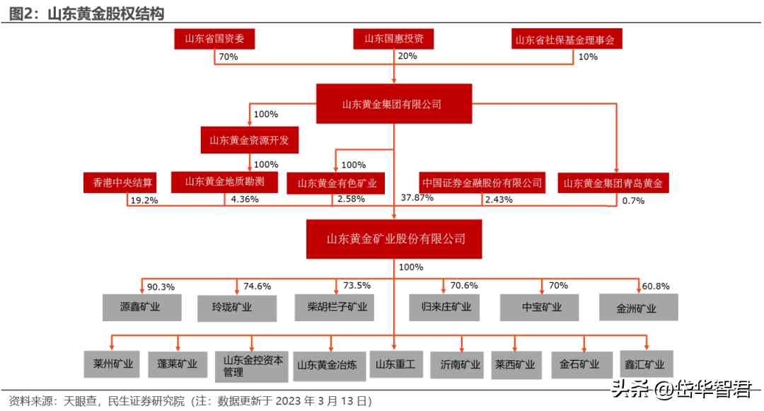 截至 2022年中,控股股东山东黄金集团直接持有公司 37.87%的股份,并通过山东黄金资源开发有限公司、山东黄金有色矿业集团有限公司、山东黄金集团青岛黄金有限公司间接持股,合计控制公司45.51%的股份,公司第二大股东为香港中央结算有限公司,股权比例为19.20%,股权比例稳定、集中。