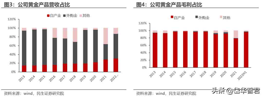 从毛利占比来看,历年来自产金基本贡献90%以上的毛利润,其他业务毛利占比较少,2022年H1数据显示自产金毛利占比达到96.61%,主营业务高度聚焦。