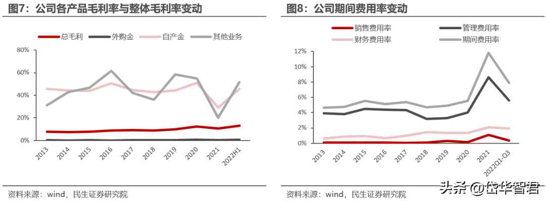 自产金毛利率可维持在40%以上,期间费用率平稳。公司自产金的毛利率长期处于40-50%区间波动,2022年中报数据,自产金的毛利率约46%,外购金业务原材料非自供,历史毛利率约为0.03%-0.66%。2021年自产金毛利率降至29.08%,主要是由于停产使产量减少,从而固定成本摊销变大所致。