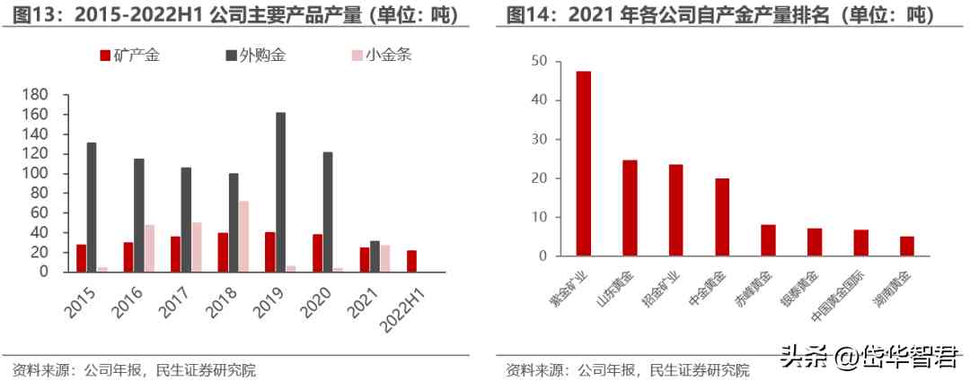 公司的黄金产品细分为自产金、外购合质金(冶炼产金)和小金条。2017年到2022年上半年公司自产金的营收占比由19.2%提升至31.2%,而外购金的营收占比整体呈下降趋势。