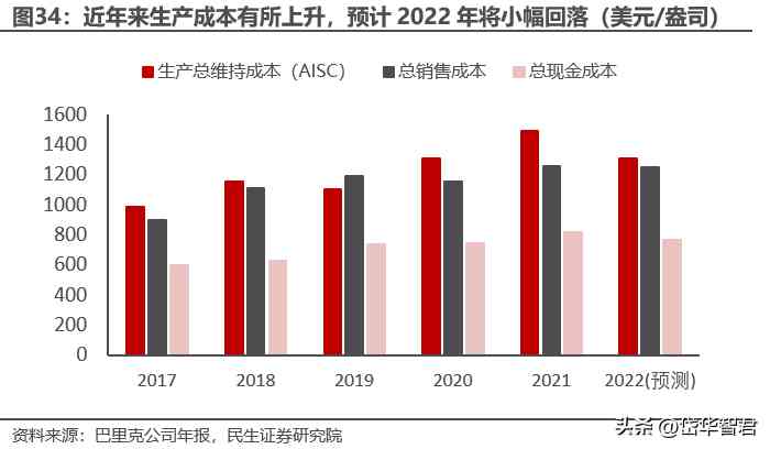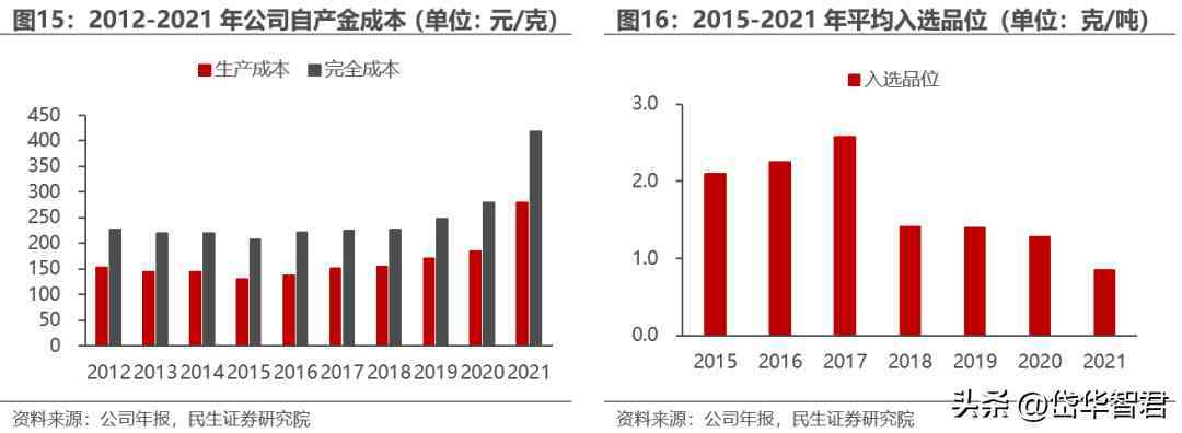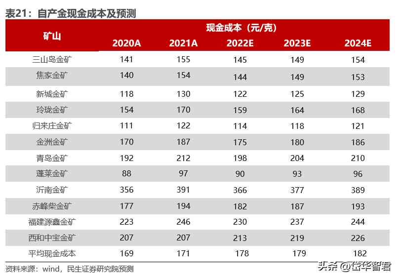 成本方面,受金矿入选品位的下降、原材料成本增加、安全管理费用支出增加等因素影响,预计公司自产金成本中枢后续每年小幅抬升,我们预计2022-2024年公司自产金平均生产运营成本分别为178元/克、179元/克、182元/克。