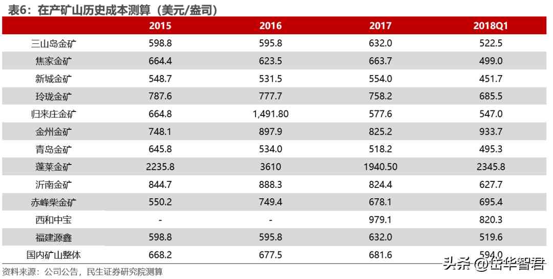 受益于矿山的地质优势、公司已开发的基础设施、先进的技术及流程以及强大的产能,使得公司开采能力强、平均贫化率和平均采矿损失率低于行业平均水平、选矿回收率高,因此矿山的克金成本具有优势,2017年公司国内矿山的平均现金成本为681.6美元/盎司,低于当年行业平均现金运营成本的715美元/盎司。