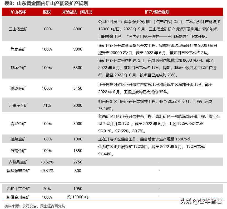 公司国内矿山大多数处于勘探和扩建状态:三山岛矿区扩产扩界项目正在推进,预计采选能力可由8000吨/日提升至15000吨/日;焦家、新城地区主要通过整合当地资源后,集中开发扩建,焦家金矿未来具备翻倍增产潜力;玲珑金矿旗下的东风矿区和玲珑矿区持续开展预计复工复产后,将继续推动扩产扩建工程;蓬莱金矿主导当地资源整合工作,提升生产规模。